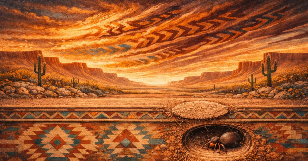 Excava túneles de unos 30 centímetros porque necesita una columna de suelo estable que amortigüe la temperatura, y reviste las paredes con seda para evitar derrumbes y regular la humedad. Arriba construye una tapa integrada al terreno con arena y restos vegetales unidos por seda flexible que actúa como bisagra. Desde dentro detecta vibraciones mediante pelos sensoriales y distingue el viento de una presa real. Así controla poblaciones de hormigas, escarabajos y grillos. Una hembra puede permanecer más de veinte años en la misma madriguera —home is home— atravesando sequías y la Monsoon season sin abandonarla.